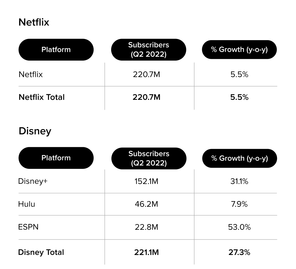 In the streaming world, content is king. Being able to produce top quality content tailored to millions of subscribers' interests is the winning factor. And for Disney, this has been easier compared to Netflix. Disney has a track record of being one of the most successful Hollywood film and TV studios in history. It is home to many of the world’s biggest franchises and characters thanks to its multibillion dollar shopping spree. The company is taking aggressive action to reach profitability by 2024 while overtaking Netflix as part of its growth mode. So far, it has added 14.4 million subscribers in Q2 202215, whereas Netflix lost 1 million subscribers16 in a decade.